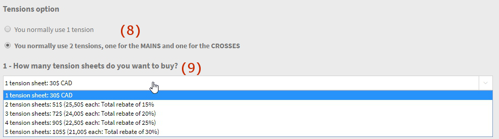 (9) Atentie la acest punct. Prima optiune din lista este pentru un singur tabel de tensiune (pretul este exprimat in dolari canadieni dar se va face conversia la momentul platii). Aveti posibilitatea de a opta pentru 2, respectiv maxim 5 tabele de tensiuni iar acestea vor tine cont de alegerea pe care o veti face la punctul (10). Aceasta optiune este folositoare in special in situatia in care folositi tensiuni de racordare diferite in functie de anotimp, suprafata de joc etc. Dupa cum observati, pentru fiecare tabel in plus veti obtine un discount.